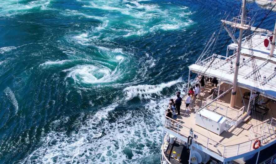 淡路島の福良港から出航する「うずしおクルーズ」では、うずしおが発生するスポットのすぐ近くを通過します。間近で見るうずしおは、想像をはるかにこえる大迫力!