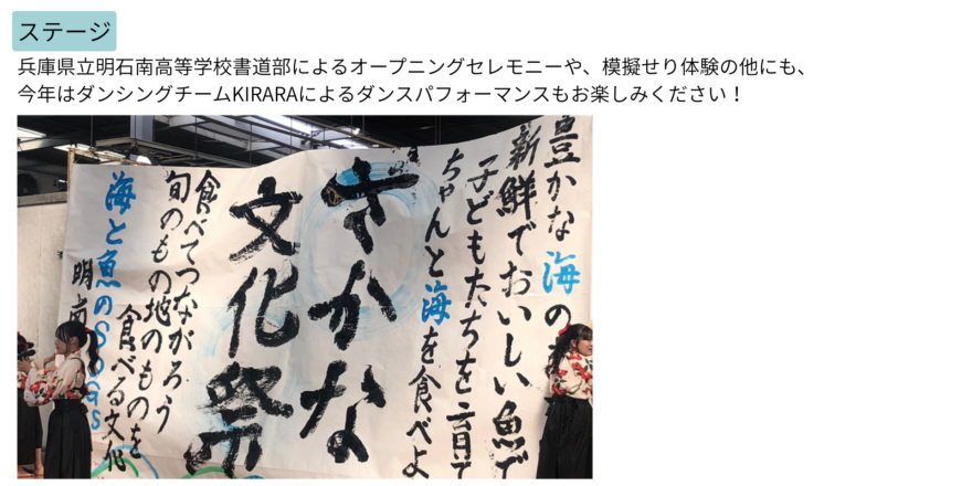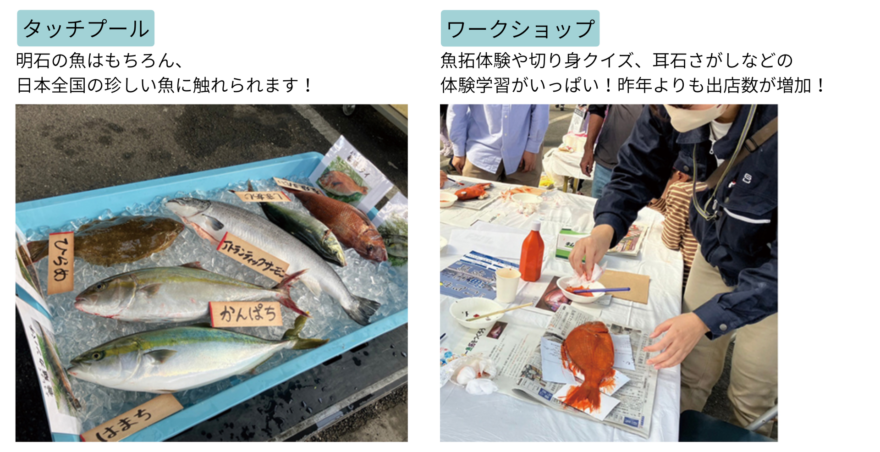今年の「さかな文化祭あかし」は昨年よりバージョンアップした内容で、魚に触れられる「タッチプール」、明石の魚にちなんだ料理を味わえる「フードコート」、漁網くぐりや魚拓体験、竹輪づくりなどの体験学習ができる「ワークショップ」「物販」「展示」、模擬競りなどの「ステージ」や、地元の子どもたちの海に関する研究の紹介なども。