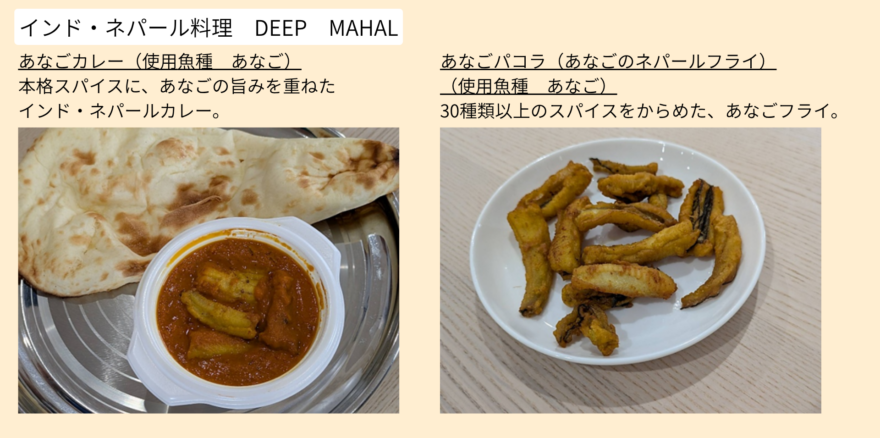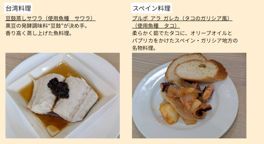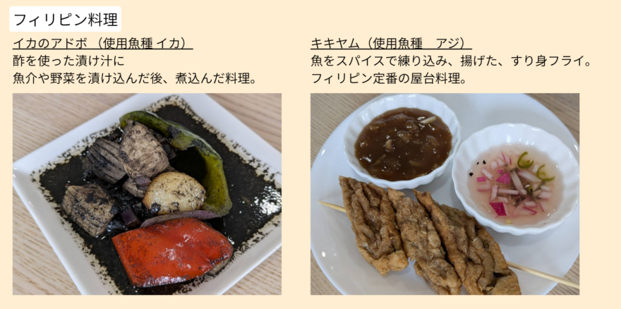 特に「フードコート」では、明石の魚や市場の魚を使った多国籍料理を販売。市内で飲食店を営んだり、料理人として働いたりしている外国人が出身国の料理を考案し、普段なかなか食べる機会のない、フィリピン、台湾、スペイン、インド・ネパールの魚料理が並びます。