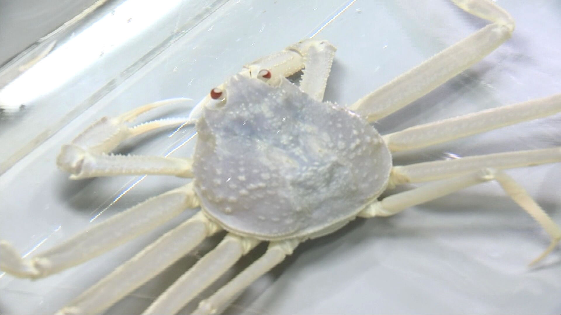豊岡市の城崎マリンワールドでは、全身が白い珍しいズワイカニが展示されています。