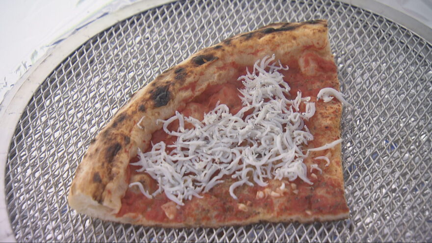 夜明け前のシラス漁で収穫される、透明度の高い「神戸夜明けのしらす」をたっぷり乗せた「しらす丼」やピザなども販売され、訪れた人たちは地元の海の幸を堪能していました。
